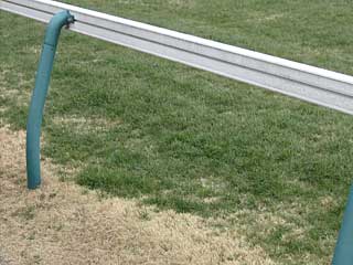 この時期、野芝は茶色く枯れるため、 オーバーシードによるレースが行われていますが、ラチ沿いを見るとその様子がわかります。 茶色く枯れているのが野芝、緑色の部分が洋芝。 オーバーシードの導入により、1年中緑のターフでレースが行われるのは素晴らしいです。 |