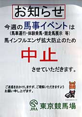 先々週は雪、先週は北海道に行っていたので、2008年の東京競馬を生観戦するのは個人的に今日が初めて!! 昨年の JC以来、約2ヶ月半ぶり!! それはそうと、2/15に東京競馬場の乗用馬1頭が、 馬インフルエンザ検査で陽性となり、今週は東京競馬場の乗馬センター繋養馬によるイベントなどが全て中止となった。 ホースリンクでの馬の展示もありません。残念。 |