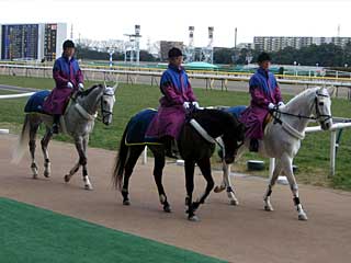 万全を期すため、 誘導馬も急遽、 福島競馬場から遠征させる措置。 普段は福島で仕事をしている誘導馬たち。 突如、東京での登板でさぞかし驚いているのでは? 左から フサイチアシュラ、 ポートブライアンズ、 テンリカウント。 |
