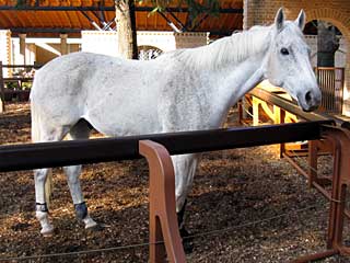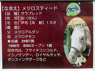 本日、 ホースリンクで展示されていたのは メジロスティード。 1996年2月4日にデビュー勝ちしたものの、クラシックには乗れず、翌1997年に4連勝を含む5勝をあげてオープン入り。 1998年にはBSNオープンを勝って初のオープン勝ちをしたものの、重賞では1999年AJC杯3着が最高で、明け9歳の2002年中山金杯でシンガリ負けを喫して引退。通算成績29戦7勝。 |  |  |
