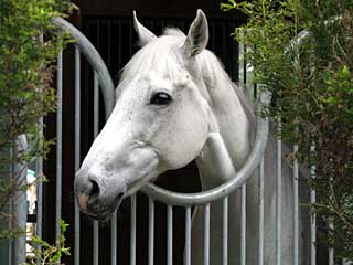 同じく ホースリンクの厩舎裏側から、 アルスブランカが顔を出してました。 厩舎裏側は木が植えられていて、馬も顔をなかなか出してくれないし、木々の隙間から顔を伺うのも難しいのですが、ポーズまで決めてくれました! |  |  |