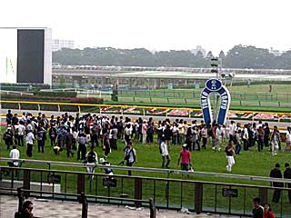 いよいよ 芝コース開放!! とりあえず4コーナー方向へ。 さっきレースが終わったばかりなのに、もう仮柵の撤去作業が始まってました。 |