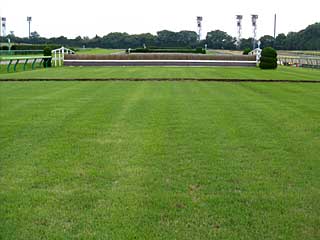 最後に 芝コース。 向こう正面の芝コースに入るのは、2002年6月9日に行われた東京芝2400m本馬場開放「 ファイナルダービー」以来だ! で、この芝コースを横断すると 南門に到着。 けど、到着後、すぐさま引き返す。 |  |  |