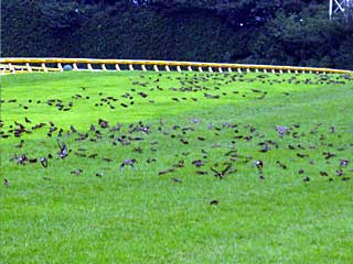 芝コースを横断中。 向正面から3コーナー方面を見たところ。 その直後、どこからともなく鳥の大群がやってきた! 芝コースはあっという間に鳥で埋め尽くされる。 レース中なら大変なことだ! |  |  |
