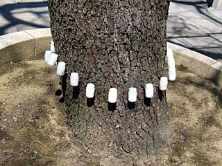 ローズガーデンを歩いている最中、 ヒマラヤシーダーの根元に見慣れぬ光景が。 どうやらこの木は弱っているらしく、 樹木活力素なる薬が投与されてました。 確かに周りの木は葉をいっぱい蓄えているが、この木だけ、常緑樹であるはずなのに葉っぱが1枚も付いてない。 元気に回復してくれることを祈るばかり。 |  |  |