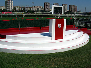 コースは右回り。1周2020m。 ゴール板の前に ウィナーズサークルがあります。 また、外側は芝コース、内側がダートコースになっており、ダートコースのゴール板のみ装飾がありました。 |