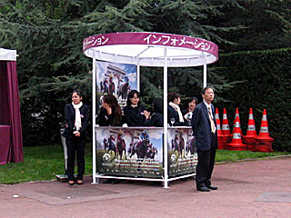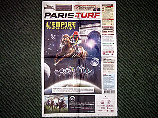さらに入場門前にて競馬新聞を購入。 買うのは当然、 パリチュルフ( Paris Turf)。 右が仏語版、左下が英語版。 そして、何故だか日本語版も置いてありました。 といってもペラ1で、中は見開きでオルフェーヴルとキズナの写真、裏表紙は凱旋門賞の出走馬一覧を掲載しているだけのもの。 |
