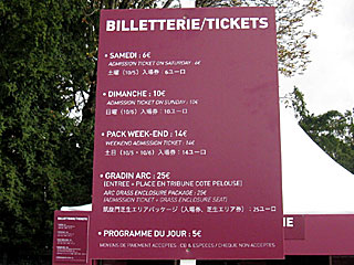 今日明日は「 ウィークエンドロンシャン」として、凱旋門賞を頂点にG1競走が目白押し! よって、入場券も「Weekend Pass」として2日券が用意されています。14ユーロ(約1890円)。※1ユーロ=約135円 ちなみに土曜のみだと6ユーロ、凱旋門賞当日の日曜のみだと10ユーロ。 7年前は土曜4ユーロ、日曜8ユーロだったので、それぞれ2ユーロずつ値上がったかたち。 けど、当時は1ユーロ=160円くらいだったので、円換算では大して変わらず… |