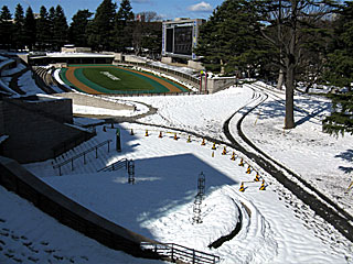 今日は朝から良い天気ですが、一昨日に降った雪がコース上を含め、場内にまだまだ積もっています。 |  |  |