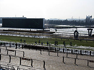 朝、東京競馬場に立ち寄った際、芝コースはまだ除雪作業が行われていました。