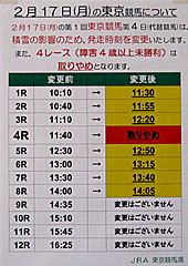 今日の 東京競馬場は、 2/9(日)分の代替競馬が実施されました。 しかし、 2/14の大雪の影響がまだ残っているため、4Rの障害競走を取り止め、7Rの芝2000mを芝1800mへ短縮し、1Rの発走時刻を10:10→11:30に繰り下げての実施となりました。 |