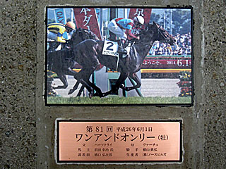 台風11号は未明に高知県に上陸! 東京競馬場も朝から猛烈な雨や強風となりましたが、小倉、新潟、札幌とも、競馬が中止になることはありませんでした。 昼頃には一時的に雨も止んだため、 ダービーロードを見に行く。 先月、銘板だけ確認できた ワンアンドオンリーのパネルですが、ようやく写真も設置されたようです。 |