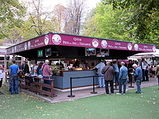 明日の凱旋門賞当日は混雑必至のため、おみやげグッズ類は今日見てみることに。 場内にいくつか出店しているギフトショップのテントを覗いてみる。 けど、特に欲しいというものは見当たらなかった。 しかも、どれもこれも高過ぎ! |