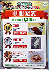 現在開催中の「 東京競馬場グルメグランプリ2014」も今週が最終週。 そして、最後の中間発表が掲示されていました。 1位:戸松「鳥ももポテト」500円(いいね!得票率98.0%) 2位:耕一路「モカソフトクリーム」300円(いいね!得票率97.5%) 3位:ドマーニ「昔ながらのミートソース」570円(いいね!得票率96.7%) 先週は3位だった戸松の「鳥ももポテト」が首位に! 最終結果発表は 11/8(土)です! |