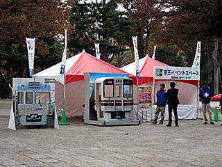 今日のメインは 京王杯2歳Sということで、例年通り、正門前広場にて「 京王イベントスペース」が開設されていました。 京王線9000系や 井の頭線1000系の顔出しパネルの設置、鉄道模型など展示の他、京王電鉄のゆるキャラ「 けい太くん」も来場していました。 |  |  |