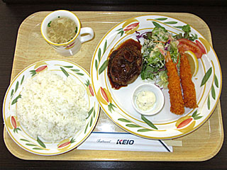 その後、朝メシ。 フジビュースタンド5Fの 「ブラッスリーろんたん」へ。 「 ハンバーグと海老フライ」を注文。 ハンバーグも、エビフライも、普通においしくいただきました。 |