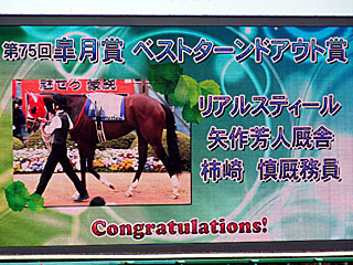 皐月賞のパドック。 最も手入れが行き届いた馬に贈られる「 ベストターンドアウト賞」は、 リアルスティールを担当している矢作厩舎の 柿崎慎厩務員が受賞。 ベストターンドアウト賞も最近のGⅠでは恒例になってきたなぁ。 |