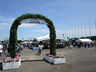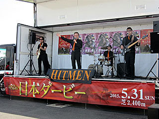 今日は昨日にも増して混んでいる 東京競馬場。 内馬場では 昨日に引き続き「 ゴールデンウィーク・グルメホリデー!」が行われていました。 また、グルメ会場に設置された臨時ステージでは、5/3,10,17の日曜日限定で、 ブリティッシュバンドの生ライブが行われており、今日は「 HITMEN」というグループが演奏を行っていました。 |  |  |