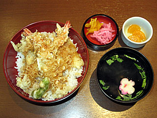 お昼は レストランプラザにある 「鳥駒」へ。 シンプルに「 天丼」を注文。 ご飯の上にはエビ天2尾、キス天、白身魚(何だか判別できなかった…)、ししとう天。 衣もサクサクでおいしかった! |
