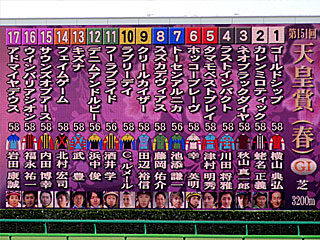 そして、京都競馬場では 天皇賞春。 1番人気は キズナで3.3倍、2番人気は ゴールドシップで4.6倍と2強ムード。 レースでは ゴールドシップが枠入りを嫌い、結果的に目隠しされてようやく収まる。スタートすると キズナは例によって後方に下げるが、 ゴールドシップはさらに下がって最後方。1周目の直線で ゴールドシップは少し順位を上げると、向正面で早くもスパートして好位に取り付き、直線ではさらに伸びて優勝! なんというか、型破りな競馬。 ゴールドシップは2012年の 皐月賞、 菊花賞、 有馬記念、2013年の 宝塚記念、2014年の 宝塚記念に続きGⅠ6勝目。鞍上は 横山典弘騎手。 |
