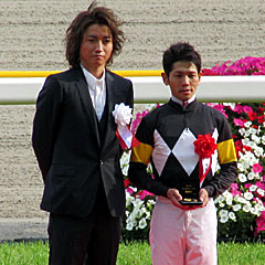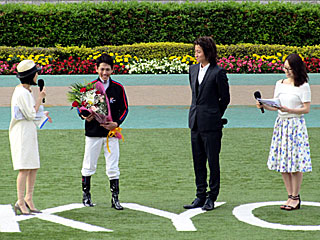 その後の表彰式。 プレゼンターとして、JRA-VANのCMに出演している 藤原竜也さんが来場。 戸崎圭太騎手との2ショット。 |