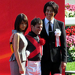 日本ダービー表彰式。 プレゼンターはJRAのCMに出ている 瑛太さんと 有村架純さん。 M.デムーロ騎手との3ショットで記念撮影も。 |