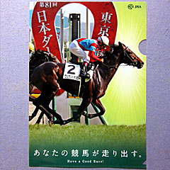 続いて、日本ダービーの馬券500円分を提示した先着5500人が参加できる スペシャルDVD抽選会に参加。 結果、A賞のDVDは当たらず、B賞の「 あなたの競馬が走り出す。オリジナルクリアファイル」をもらう。 |