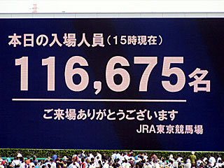 さらに、15時現在の入場者がターフビジョンで発表される。 その数、11万6675人。 昨年は13万182人だったので、昨年と比べると約1万3500人少ない計算だが、圧倒的に今年の方が混んでいる気がするのは気のせい? ちなみに、ダービーデーの最終的な入場者数は12万9579人とのこと。 |