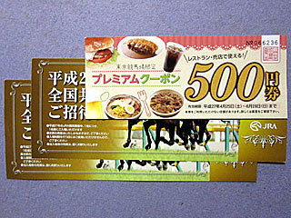 そして メガグルメダービー抽選会に参加。 5/2から毎週行われているメガグルメフェスティバルにて、500円以上の商品を購入すると抽選券をもらえ、抽選券3枚で抽選会に1回参加できるというもの。 抽選券は計9枚集まったためチャンスは3回。 結果、競馬場無料入場券2枚と、プレミアムクーポン券1枚の収穫。 |