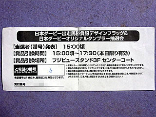 さらに、日本ダービーの馬券1000円分を提示し 日本ダービーデザインフラッグ&オリジナルタンブラー抽選会へ。 必要事項を記入したアンケート用紙を提示して応募完了。 抽選結果は15時頃に発表とのことだったが、案の定、ハズレる。 |