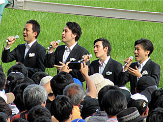 午後になり、徐々にダービーの発走時刻が近付いてくる。 出走馬の本馬場入場および返し馬が終わった後、ウィナーズサークルにて国歌斉唱。 今年の国歌斉唱は「 jammin'Zeb」というジャズコーラスの4人組。 「 ジャミンゼブ」と読むそうです。 |