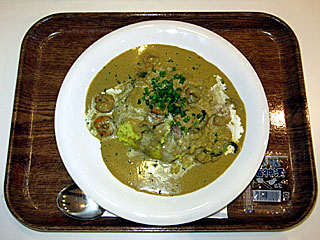 昼、 フジビュースタンド3Fにある 「ヒットカフェ」でメシ。 「 インドカレー」を注文。 ココナッツミルクの風味がすごく、辛さはほとんどなくマイルドな味わい。 具材もエビ、イカ、タコなどの魚介が満載! ウマイ! |