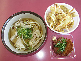 今日はまずメシから。 フジビュースタンド4Fの 「むぎんぼう」へ。 「 ねぎ塩豚うどん」と「 かきあげチップ」「 さつまあげ」を注文。 ねぎ塩豚うどんはいい感じに塩が効いていておいしかった! かきあげチップはここの名物かきあげうどんにも使われているものをトッピングだけ単品販売したもの。塩がかかっていてそのまま食べるとサクサクとおいしいが、最後はうどんに投入! さつまあげは生姜醤油との相性抜群で、これまたおいしい! |