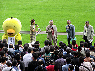 お昼休み、ゴール前特設ステージにて「 毎日王冠予想検討会」が行われました。 鈴木淑子さん、 井崎脩五郎、 丹下日出男さん、 松沢一憲さんと、毎日新聞のマスコットキャラクター「 なるほドリ」も参加。 |