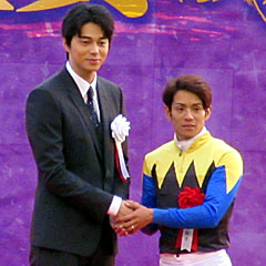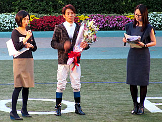 最終レース終了後、パドックで恒例の レース回顧イベントが行われました。 司会はお馴染み 細江純子さんと 谷桃子さん。 天皇賞を制した 浜中俊騎手を招いてのトークショー。 |