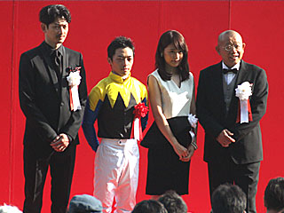 表彰式にはプレゼンターとして、 JRAナビゲーターの 笑福亭鶴瓶さん、 瑛太さん、 有村架純さんの3人が来場。 瑛太さん、 有村架純さんは 昨年も来ていたが、 笑福亭鶴瓶さんがプレゼンターとして来場するのは初めてのこと。 |
