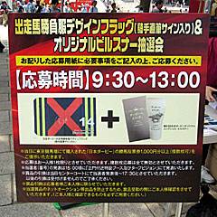 今度は「 日本ダービーデザインフラッグ&オリジナルピルスナー抽選会」に応募。 日本ダービーに出走する18頭の勝負服をデザインした小旗とオリジナルピルスナーが当たるというもの。 当選者は18名という狭き門で、案の定ハズレ。 |