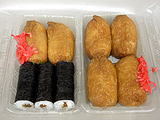 今日は場内が混雑しているため、空いてる店を探して簡単に昼メシ。 まずは 「戸松」へ。 「 いなり寿司」を購入。 いなり寿司4個入りのと、いなり寿司2個+かんぴょう巻き3本の2パターンあったので両方買ってみる。 味は普通にいなり寿司とかんぴょう巻き。 |