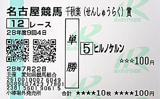 今日は道営開催がないため、他場発売のみ。 記念に 名古屋競馬の 千秋楽特別の馬券を買ってみる。 馬券には印字されたのは「 小樽場外発売所」。 |