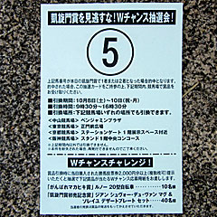 今日は朝、とりあえず 東京競馬場へ。 凱旋門賞の国内馬券発売を記念し「 凱旋門賞を見逃すな!Wチャンス抽選会」が行われました。 朝9:30より先着1000人に、当日購入した500円分の馬券提示で1~15の馬番カードをランダムに1枚配布。 凱旋門賞優勝馬の馬番カードが当たりで、豪華賞品がもらえるというもの。 自分がもらったのは単勝14番人気の5番 ワンフットインヘヴン。 勝つのは厳しいなぁ… |