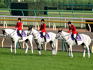 初日のメインは サウジアラビアロイヤルカップ。 その誘導を務めたのは オメガオンリーワン、 キモンホワイト、 ストラディヴァリオでした。 ちなみに朝からの土砂降りは、午後になって上がりました。 |