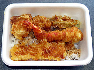 昼メシは フジビュースタンド2Fの 「てんや」へ。 「 東京オールスター天丼」を注文。 海老天、 いか天、 ホタテ天、 鶏つくね天、野菜天2品( レンコン天、 オクラ天)という陣容。 ご飯が少々少ない気もしたが、まずまずおいしい。 |