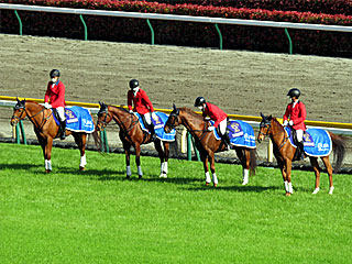 本日の 誘導馬。 メインレースを担当したのは マイネルホウオウ、 ムイトオブリガード、 マイネルラクリマ、 ショウナンライズの4頭でした。 |