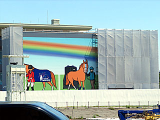 絶賛工事中の 東側ターフビジョン。 裏面に描かれた おがわじゅりさんのイラストが少し見えていました。 |
