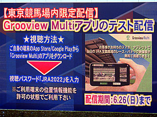 また、今日から 東京競馬場限定で「 GrooviewMulti」というアプリを使ったレース映像の試験運用が始まりました。 位置情報を利用し、場内に滞在している場合のみ、 GrooviewMultiというアプリで全場全レースのパドックやレース映像を手持ちのスマホで見られるというもの。 通信料は別途かかりますが、 フリーWi-Fiを利用すれば、場内どこにいても無料で当日の全レースを楽しむことができるようになります。 他場の平場のレースは、場内モニターまで見に行かないとパドックやレース映像を見ることができないため、これを利用すれば手元にモニターのないスマートシートや指定席でもいちいち見に行く手間が省けるという画期的なサービスです! GrooviewMultiの詳細はこちら⇒ https://grooview.com/ |