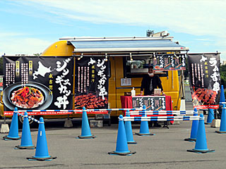 せっかくなのでグルメフェス再開を祝して朝メシ! 春開催では牛タン店だった「 MEDITRINA」がジンギスカンに鞍替えしていたので、そこで「 ジンギスカン丼」1000円。 恐らく成吉思汗たれを使った焼肉丼という感じだけど、カラーピーマンがトッピングされてちょっとオシャレな感じに。ウマイ! |  |  |
