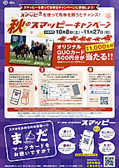 最近、 JRAは マークカードの利用を減らそうと スマッピー投票を推していて、スマッピー投票専用発売窓口の整備や、スマッピー投票の利用キャンペーンを実施していますが、今日から「 秋のスマッピーキャンペーン」と題したキャンペーンが始まりました。 スマッピー投票で購入した馬券の写真を撮ってキャンペーン応募サイトにアップロードすると、抽選で1000人に「 スマッピーオリジナルQUOカード」が当たるというもの。 |