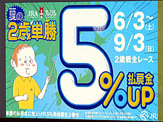 今日から早くも2歳戦がスタート! それに合わせ、毎年恒例の「 夏の2歳単勝」も始まりました。 2歳戦に限り、単勝の払戻金が約5%上乗せされる JRAプレミアムです。 |