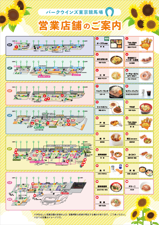 さて、夏は来場者もグッと減ることから、営業エリアも縮小されています。 普段のパークウインズで営業しているお店も一部が休業となっており、フジビュースタンド5F以上および内馬場も閉鎖となっています。 また、 昨年はメモリアルスタンドB1Fも閉鎖されていましたが、今年は開放されているため 映像ホールも利用可能になっていました。 ただし、メモリアルスタンドB1Fの ファストフードプラザにあるお店は全て休業となっています。 |
