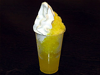 食後に フジビュースタンド2Fの 「福三」へ。 「 クリームフラッペ」を注文。 前回はブルーハワイにしたので、今日はレモンにしてみる。 といっても、かき氷のシロップは色が違うだけで味は同じだけど… 今日も暑いので冷たいソフトクリームとかき氷はおいしい! |